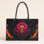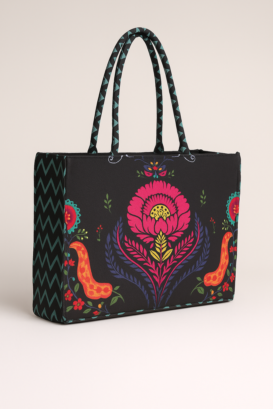 This premium canvas tote bag is designed for women who love classy, artistic, and floral styles.The sturdy handles are detailed with a soft teal chevron pattern, offering both comfort and durability. Whether you’re heading to a casual outing, shopping trip, or festive gathering, this bag is sure to make a statement..Each detail celebrates color, life, and effortless style.this tote offers elegant symmetrical detailing for a truly timeless and eye-catching look.