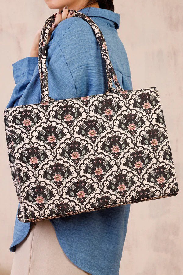 This premium canvas tote bag is designed for women who love classy, artistic, and floral styles.Upgrade your wardrobe with this chic and timeless black & white tote bag, featuring a stunning floral and geometric pattern. Designed for modern women, this lightweight yet spacious handbag is perfect for work, shopping, or casual outings. Its sturdy handles ensure comfort and durability, making it a stylish and practical everyday accessory.Each detail celebrates color, life, and effortless style.this tote offers elegant symmetrical detailing for a truly timeless and eye-catching look.